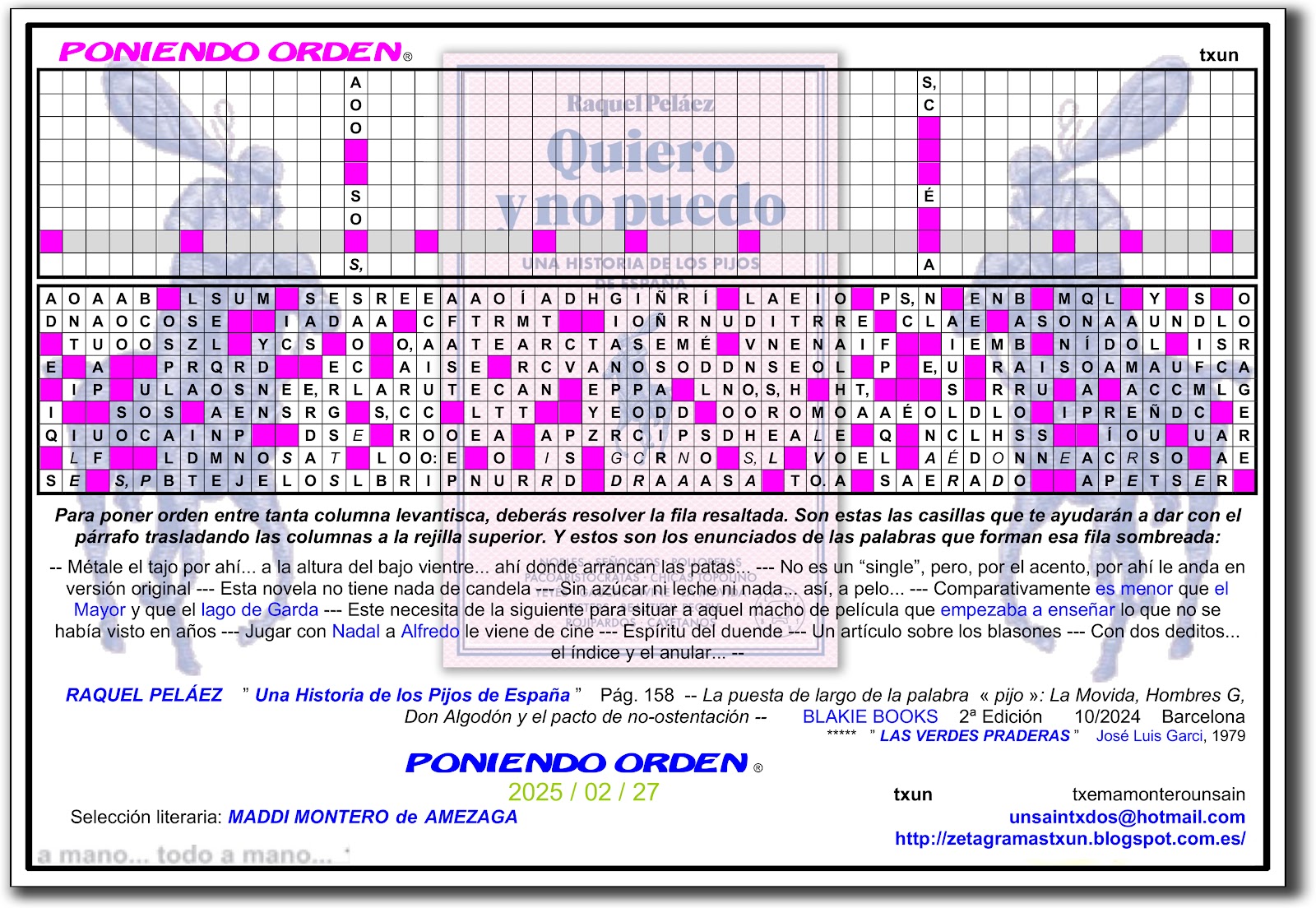 Por "ciento", en ZETAGRAMAS TXUN estamos de "cienlebración"... puedes encontrar los noventa y nueve "ORDENANDOS" precedentes en la guía por años que está a la derecha de los pasatiempos... ¡Celébralo tú también!...